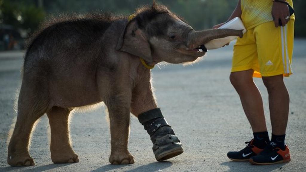 A baby elephant in Thailand who lost part of her leg in a trap has learned to walk again, with the help of a special swimming pool.