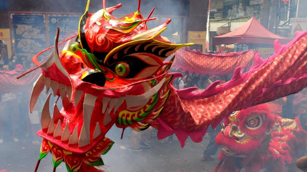 People celebrate with fireworks, giving gifts of money in red envelopes, eating special food and performing a lion dance.