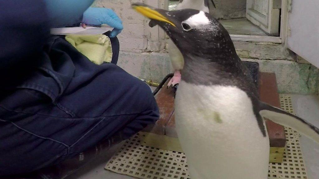 Once a month zookeepers give these rockhopper penguins at Milwaukee Zoo in America a friendly weigh-in.