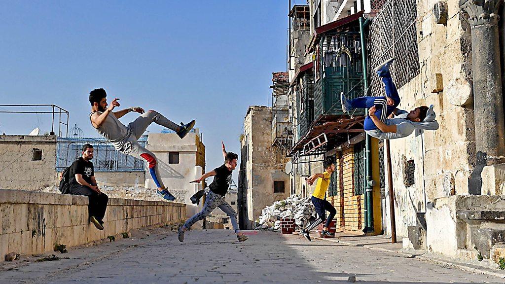 In war-battered Aleppo in Syria, Omar Kosha and his friends enjoy practicing parkour together.