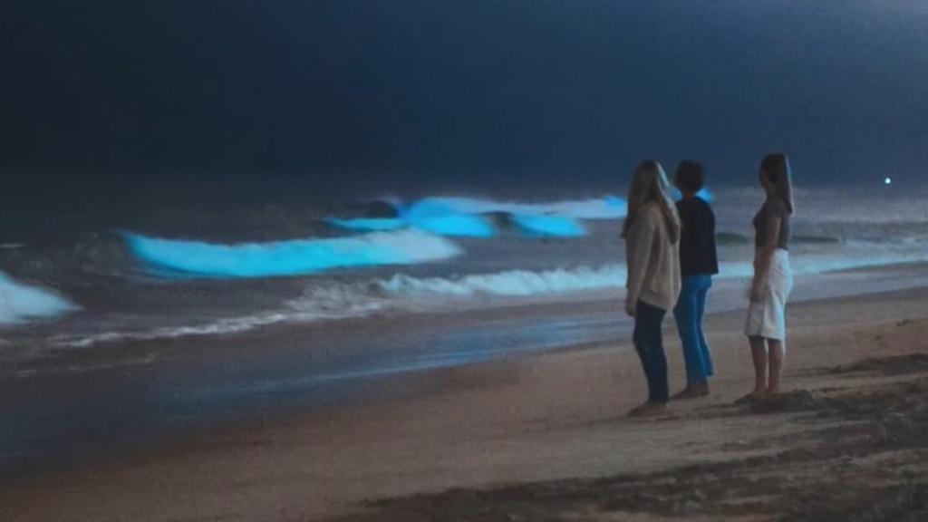 The effect is created by plankton that glow blue at night when they are moved by waves or motions in the sand.
