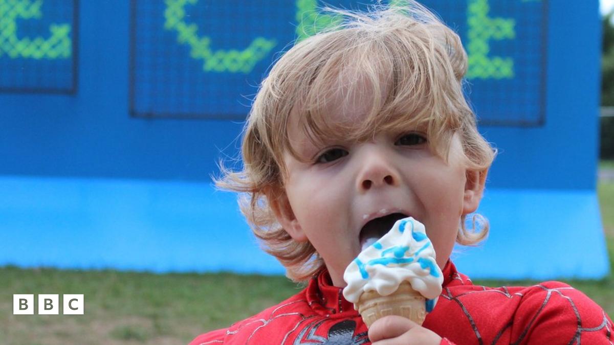 Mae Jessie o'r Fenni yn mwynhau ei frecwast hufen ia tu fas y Lle Celf // You can never have too much ice cream