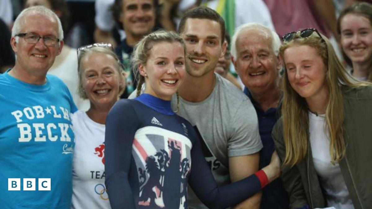 Becky James yn dathlu ennill y fedal arian gyda'i theulu a'i chariad, George North