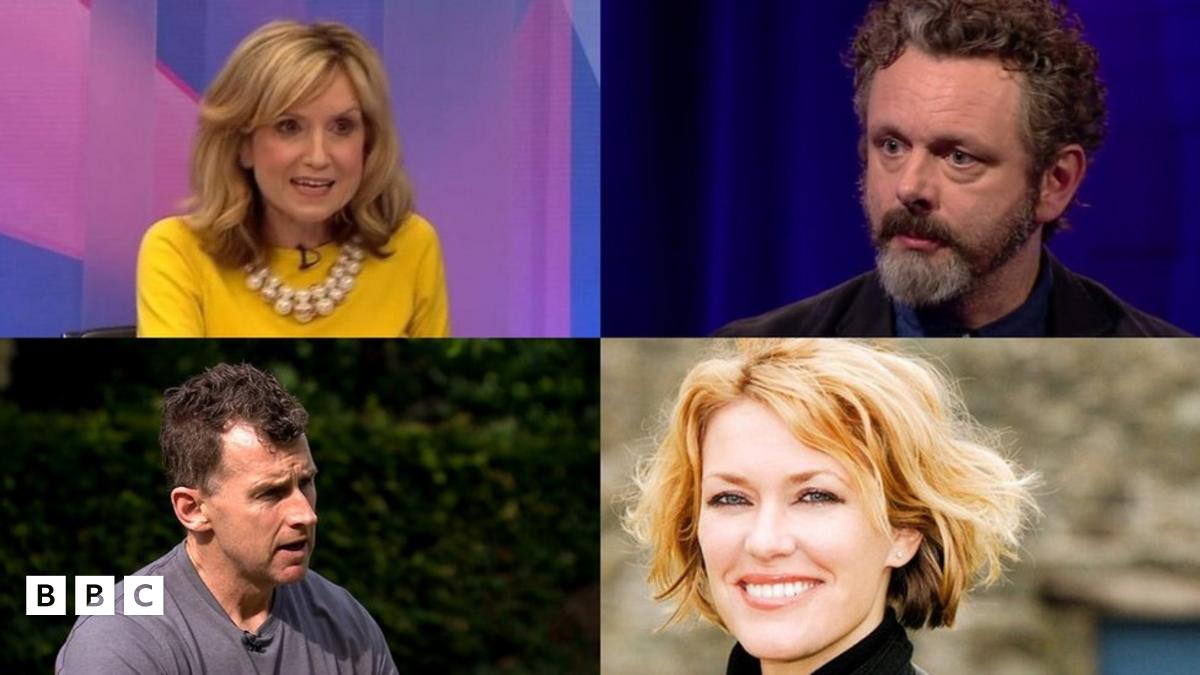 O'r chwith uchaf gyda'r cloc: Angharad Mair, Michael Sheen, Cerys Matthews a Nigel Owens