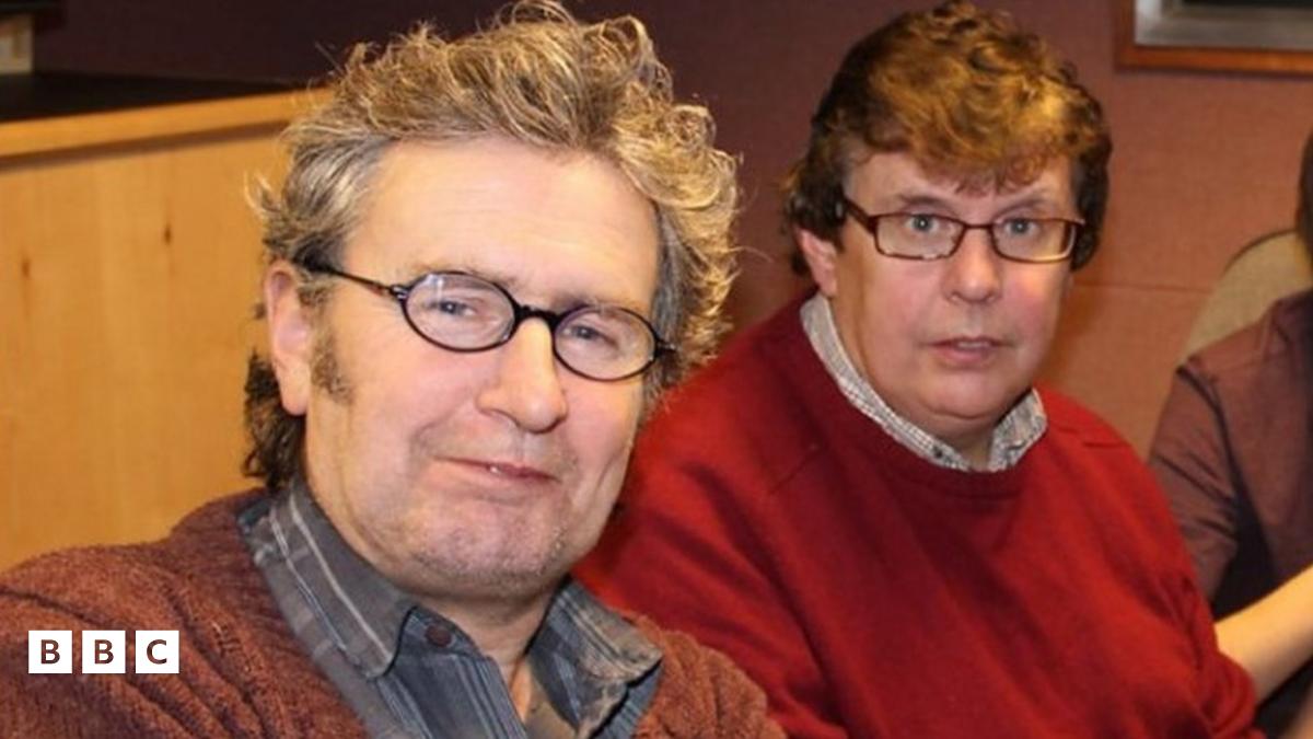 Wyn Lewis Jones ar y chwith, gyda'i frawd Richard, mewn sesiwn recordio i BBC Radio Cymru yn 2012