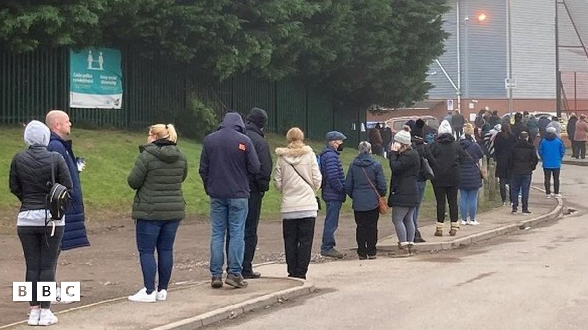 Pobl yn ciwio i gael eu brechu yn Stadiwm Cwmbrân fore Sul