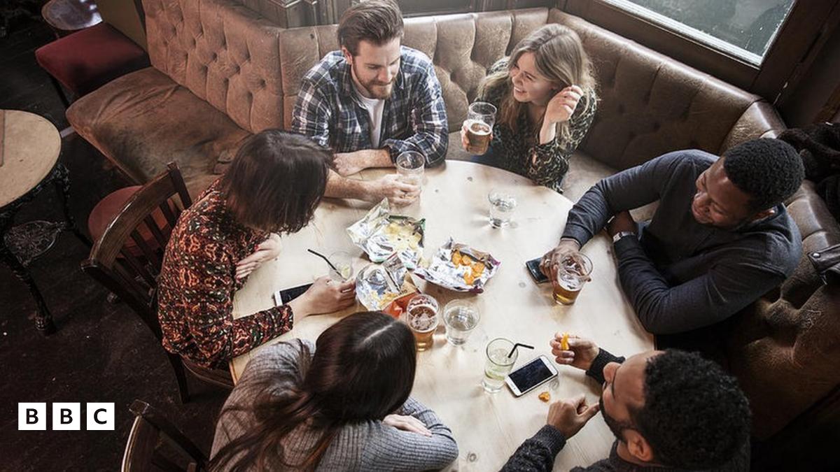 Chwech o bobl sy'n cael eistedd o amgylch bwrdd mewn tafarn, bwyty neu gaffi o 26 Rhagfyr