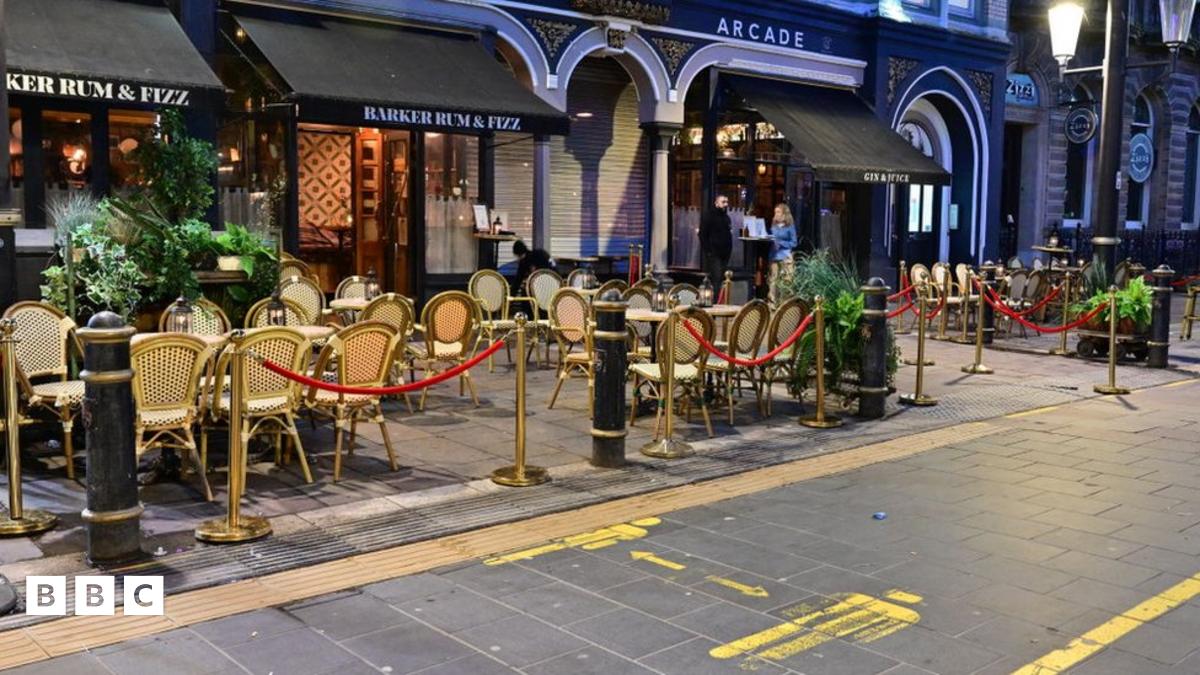 Roedd rhesi o fyrddau a chadeiriau gwag tu allan i fariau Caerdydd ar Nos Galan