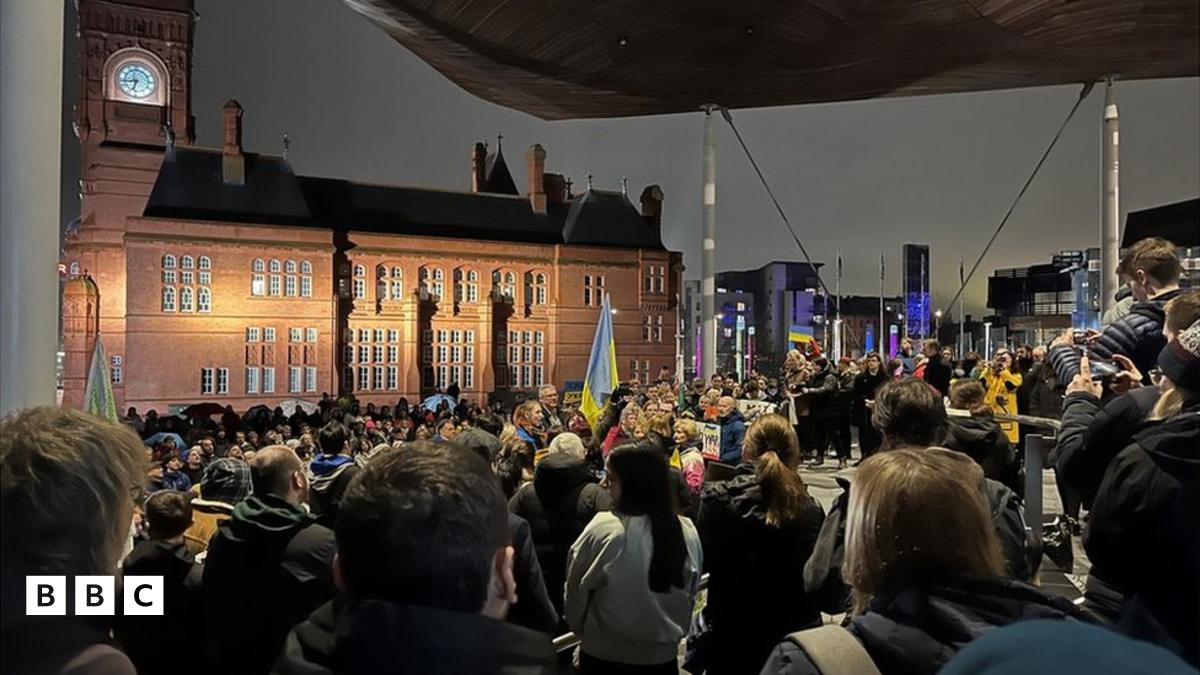 Daeth 300 o bobl i wylnos ar risiau'r Senedd yng Nghaerdydd nos Lun i ddangos cefnogaeth i Wcráin ac i wrthwynebu ymdrechion milwrol Rwsia yno.