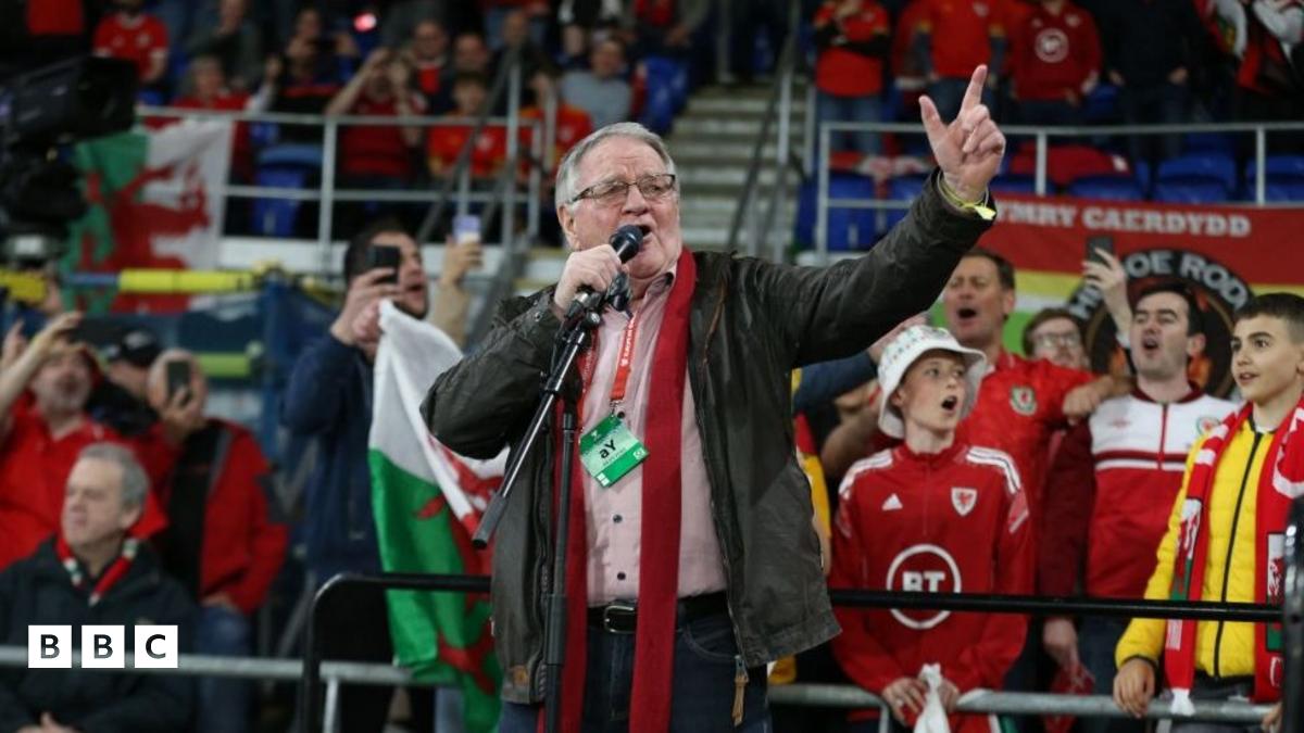 Dafydd Iwan yn Stadiwm Caerdydd ar 24 Mawrth yn cyd-ganu Yma o Hyd gyda 33,000 o gefnogwyr Cymru