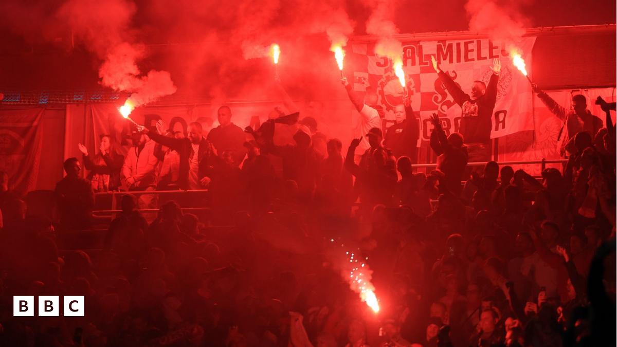 Yn ystod y gêm nos Sul cafodd sawl ffagl oleuo eu cynnau ymhlith y cefnogwyr yn eisteddle Gwlad Pwyl, cyn i dân gwyllt hefyd gael ei danio i'r awyr wedi i'r ymwelwyr sgorio.