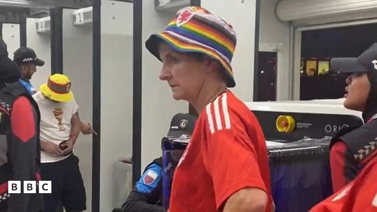 Dywedodd wrth BBC Cymru ei bod wedi cael rhywfaint o rybudd gan y rhai oedd o'i blaen yn y ciw fod swyddogion diogelwch yn stopio pobl oedd yn gwisgo hetiau enfys.