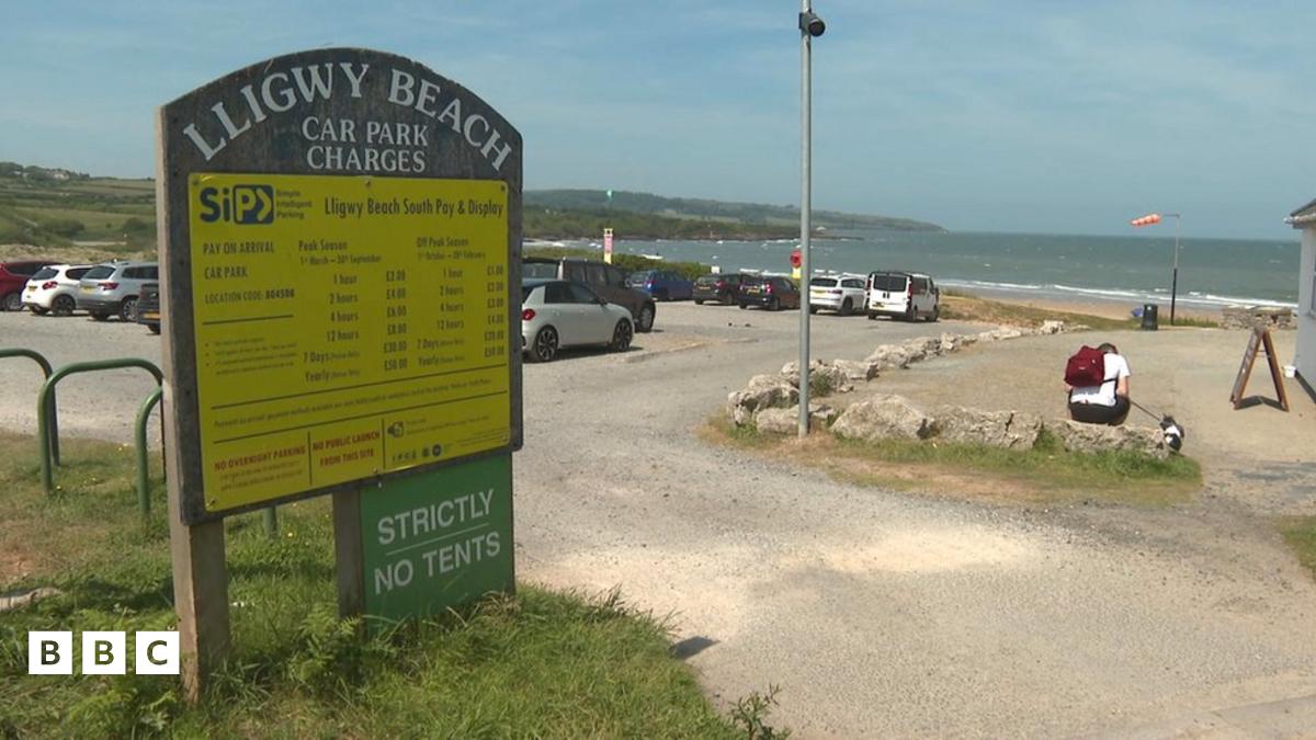 Mae'r maes parcio ger Moelfre yn eiddo i gwmni SIP Ltd ym Manceinion.