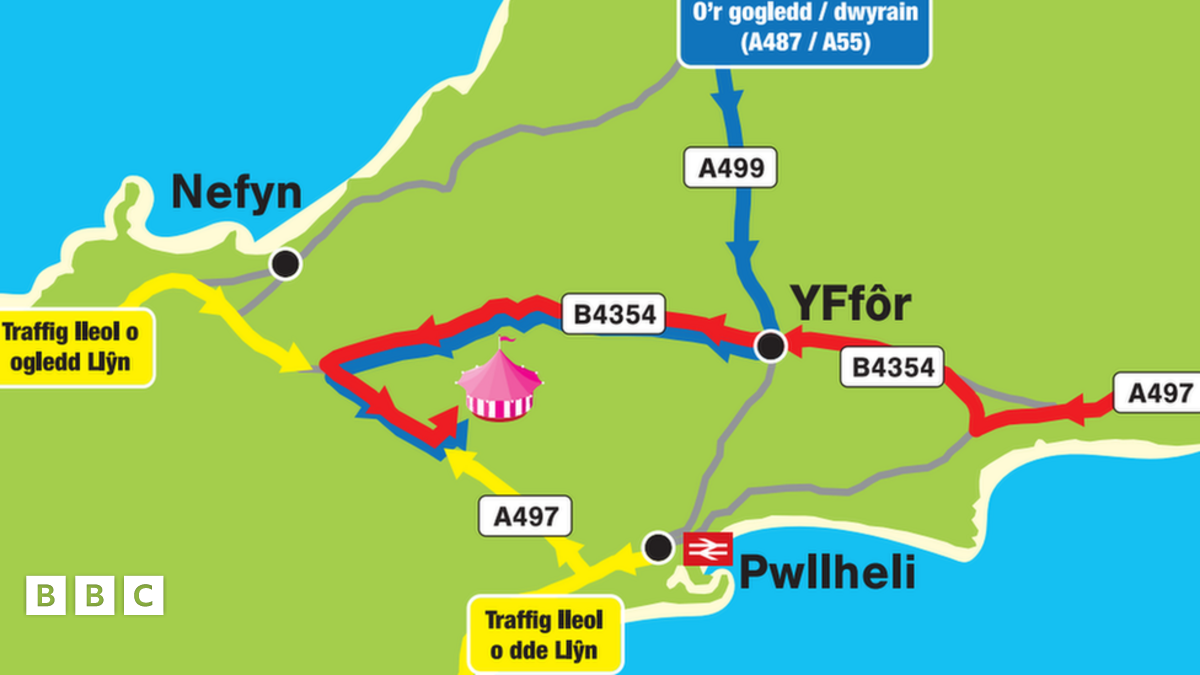 Os yn teithio o Benrhyn Llŷn, dilynwch y cyfarwyddiadau a'r arwyddion lleol wrth i chi eu cyrraedd. Bydd rhai ffyrdd lleol wedi'u cau dros gyfnod yr ŵyl.