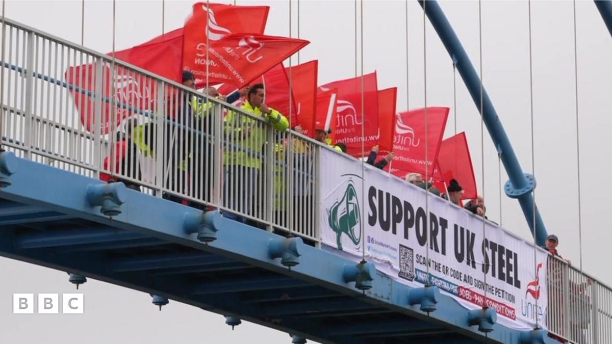 Roedd tua 25 o aelodau'r undeb Unite yn protestio ar bont yn y dref ddydd Iau wedi i'r cwmni awgrymu i undebau y gallai hyd at 3,000 o swyddi ddiflannu o fewn misoedd.
