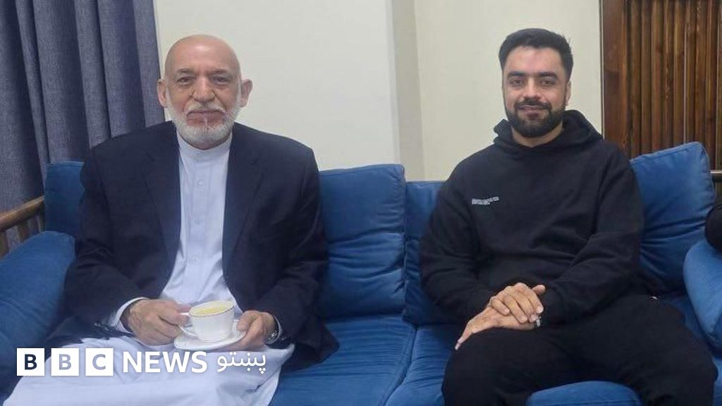 ښاغلي کرزي د کابل هوايي ډګر په انتظار خونه کې د افغانستان د کرېکټ له وتلي ستوري راشد خان سره مخامخ شوی دی.