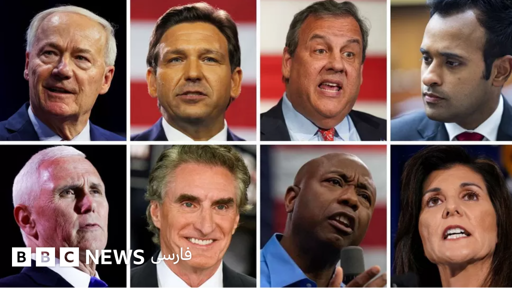 توضیح تصویر، جمهوری‌خواهانی که توانستند به مناظره اول راه پیدا کنند - ردیف بالا از چپ: ایسا هاچینسون، ران دسنتیس، کریس کریستی، ویوک راماسوامی. ردیف پایین از چپ: مایک پنس، داگ برگم، تیم اسکات، نیکی هیلی