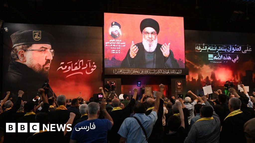 توضیح تصویر، حسن نصرالله، رهبر حزب‌الله لبنان سخنران اصلی مراسم ترحیم فواد شکر بود که از راه دور سخنرانی کرد