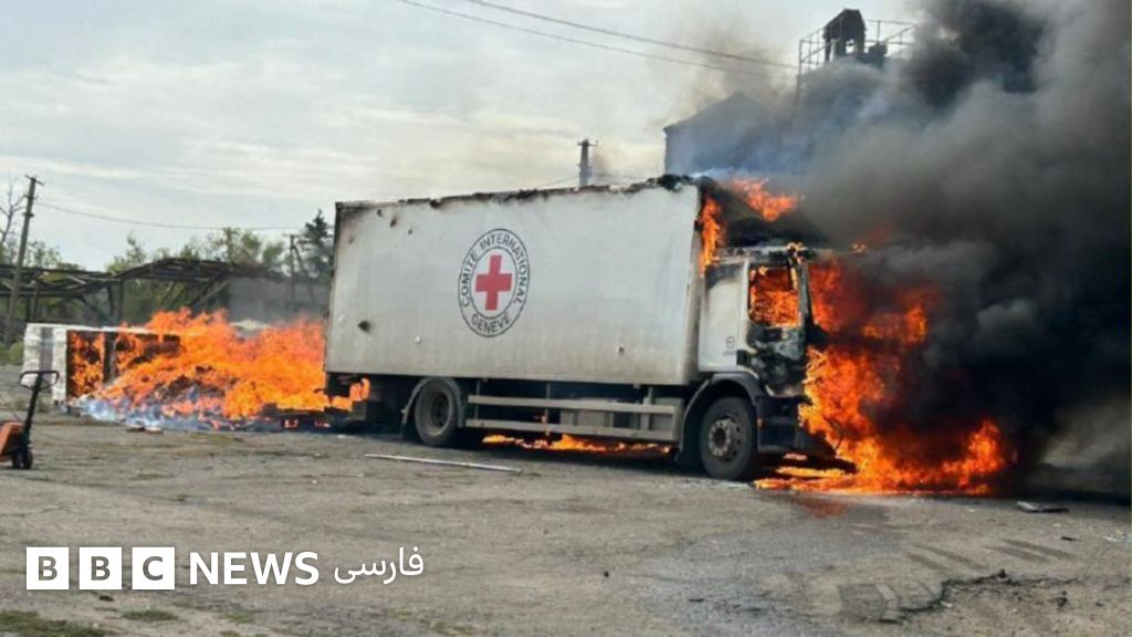 آقای زلنسکی عکسی از یک کامیون در حال سوختن منتشر کرد که یک علامت صلیب سرخ روی آن دیده میشود.