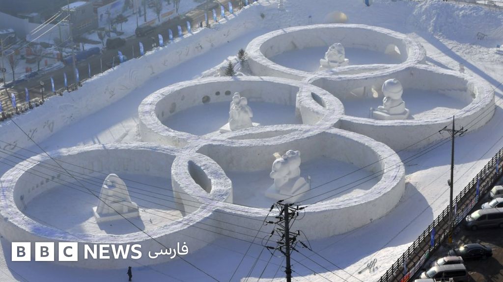 توضیح تصویر، حلقه‌های المپیک که با برف ساخته شده در نزدیکی محل برگزاری المپیک زمستانی پیونگ‌چانگ