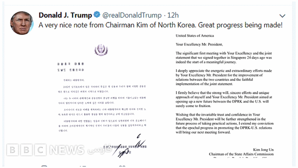 این نامه که تاریخ روز ۶ ژوئن را دارد، در توییتر آقای ترامپ منتشر شده و در آن رهبر کره شمالی با یادآوری دیدار با رئیس جمهوری آمریکا در سنگاپور، آن را نقطه عطفی در تاریخ روابط دو کشور دانسته هر چند به نتیجه ارتباطهای دو طرف در طول این مدت اشارهای نکرده است.