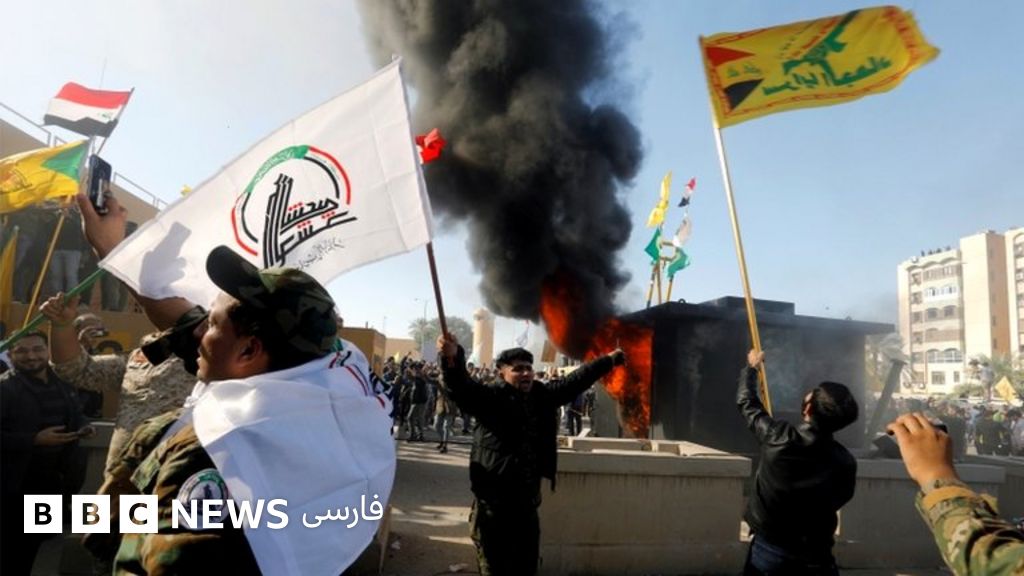 معترضان خشمگین که شبهنظامیان گروههای وابسته به ایران هم در میان آنها هستند شعار مرگ بر آمریکا سردادند و پرچم این کشور را آتش زدند.