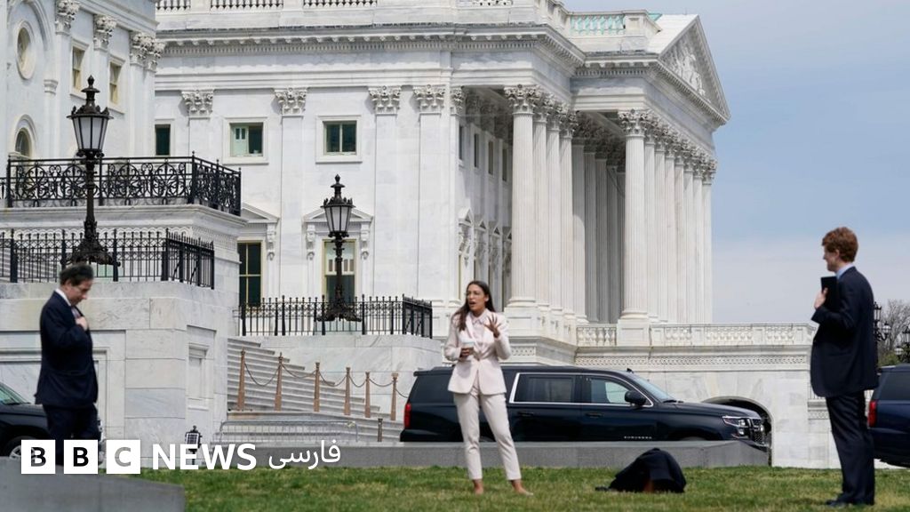 توضیح تصویر، اعضای مجلس نمایندگان آمریکا جلوی ساختمان کنگره برای حفظ فاصله موقع صحبت‌کردن تمرین می‌کردند.