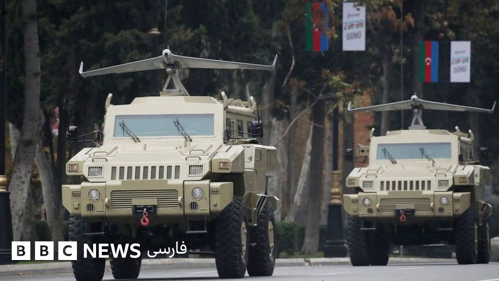 توضیح تصویر، نمایش پهپادهایی که در برنامه مشترک جمهوری آذربایجان و اسرائیل ساخته شده‌اند در رژه نظامی در باکو