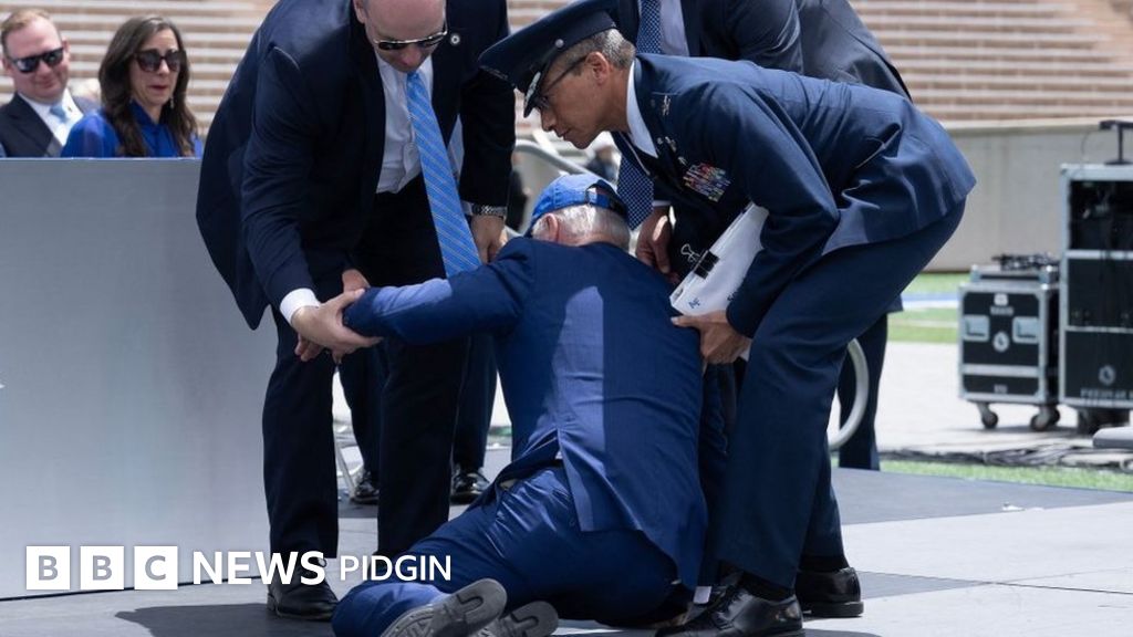 US President Joe Biden slip come fall as e dey hand out diplomas for one graduation ceremony for di US Air Force Academy for Colorado.