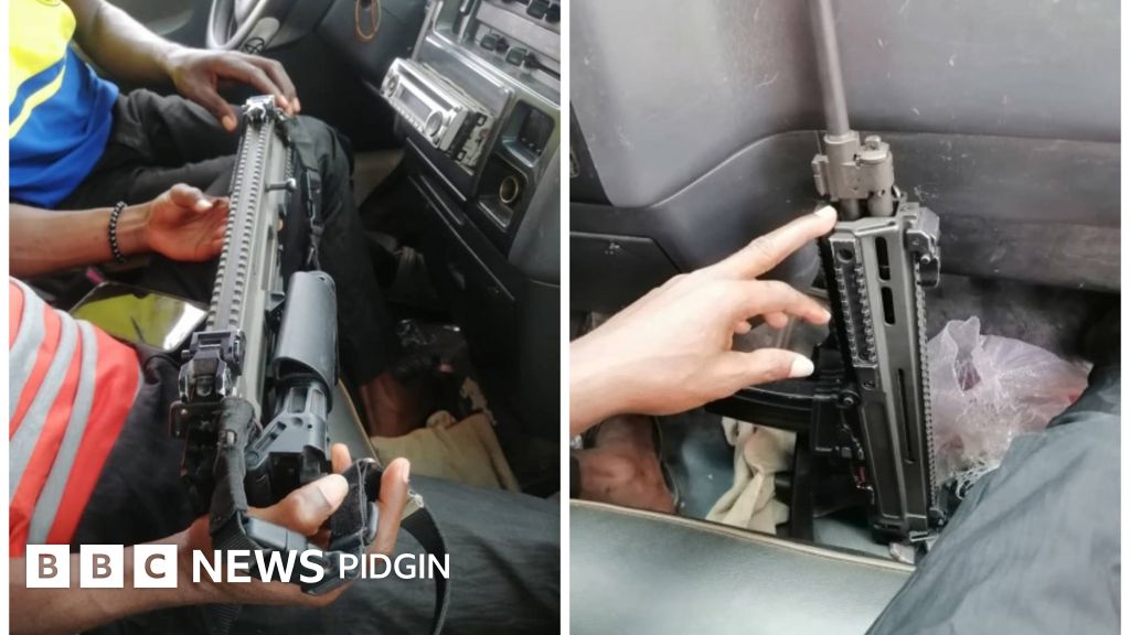 Inside video wey dey circulate on social media, you go see one civilian dey sit in front of de commercial bus dey hold black gun wey resemble AK-47.