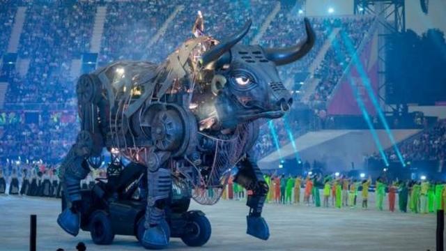 But di biggest shock na di 10m tall animatronic bull wey just run enta di stadium as part of di ceremony to honour di multiculturalism of Birmingham and di Commonwealth.