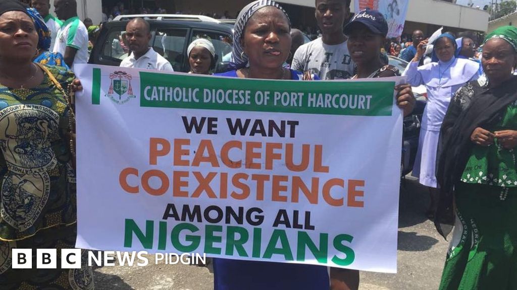 BBC News Pidgin tori pesin for Nigeria capital, Abuja, Dooshima Abu, report say Catholics for dia no care about di early morning rain, dem still come out plenti to do di protest.