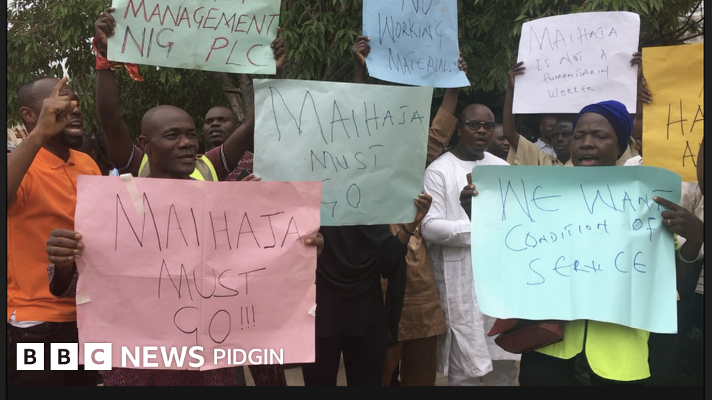 " Some of our staff die wen our assurance expire and now dia family dem dey eat from hand to mouth. Some of dem na our office pipo here dey donate moni give dem to take chop", one of di protesters tell BBC pidgin.