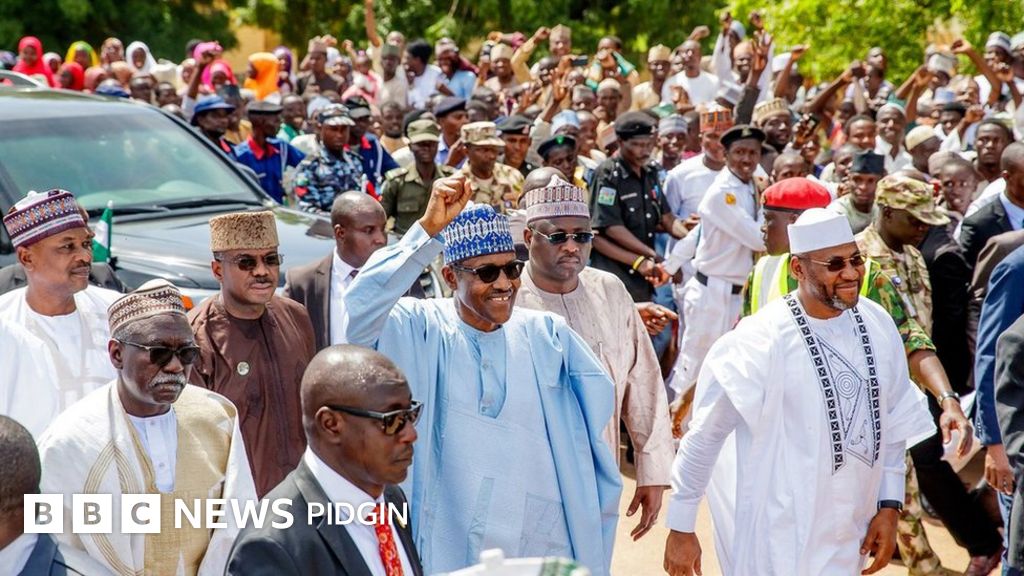 Di president pray dis one wen e follow oda Muslim for di Eid-El-Kabir prayers for Kofar Arewa Eid ground for im home town for Daura, Katsina State, North-West Nigeria.