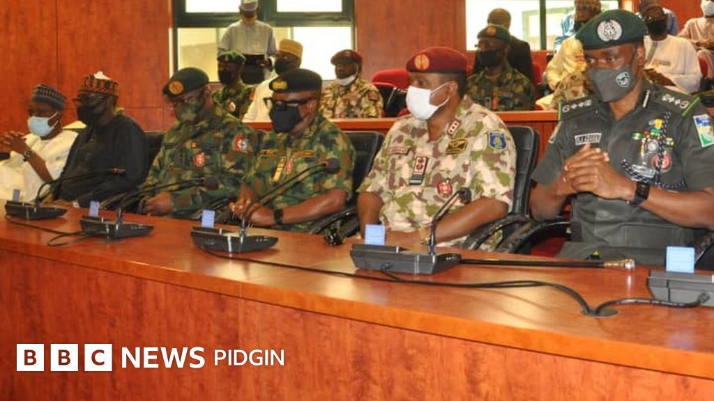 Govnor Bello Masari add on Sunday night say: "After visiting di school and community yesterday(on Saturday), we don today meet with di top echelon of di nation's defense machinery led by di Minister Gen Bashir Salihi Magashi, all in our determination to save di innocent children wey di bandits kolobi."