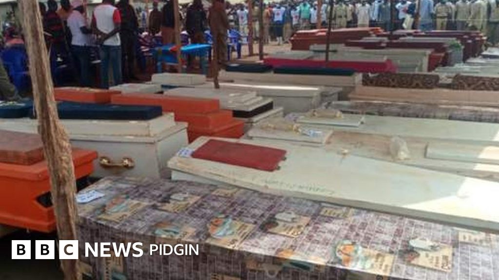 On Friday morning, just outside di Plaine Savo camp - where an estimated 20,000 pipo dey live - dem hold funeral service, with long row of coffins in front of di mourners.