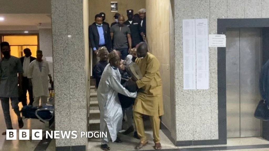 Kyari wife bin wear black cloth and bin hold her husband hand as dem stand close to di elevator wey dey di fifth floor of di Federal high court - but before you know, she come fall for ground and appear lifeless for ground.