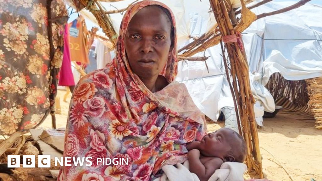 "Di baby come out, I wrap am up. I no tink of anyting else. I continue to dey waka go Adré," Arafa Adoum tok wen I meet her for refugee camp of tens of thousands of pipo on di outskirts of di Chadian town.