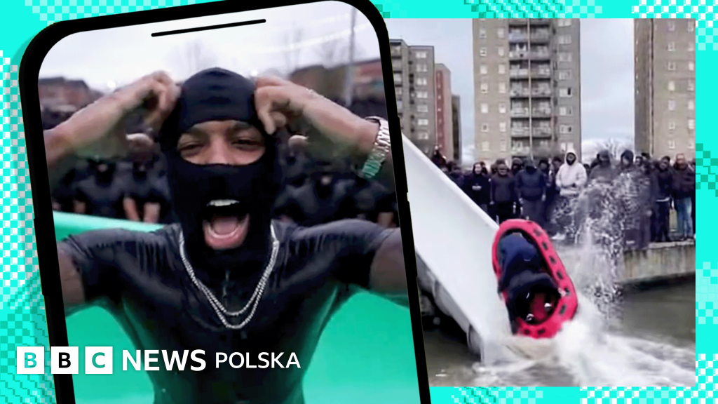 Wygenerowane przez sztuczną inteligencję nagranie pokazuje grupę młodych, głównie czarnoskórych, mężczyzn w kominiarkach i puchowych kurtkach, zjeżdżających ze zjeżdżalni wodnej do brudnego basenu, na którego powierzchni unoszą się śmieci.