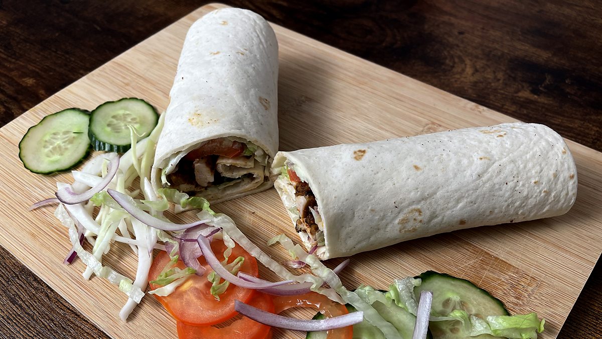 - Lay salad of your choice, leaves, sliced tomatoes, sliced red onion, and shred pieces of the chicken on top.