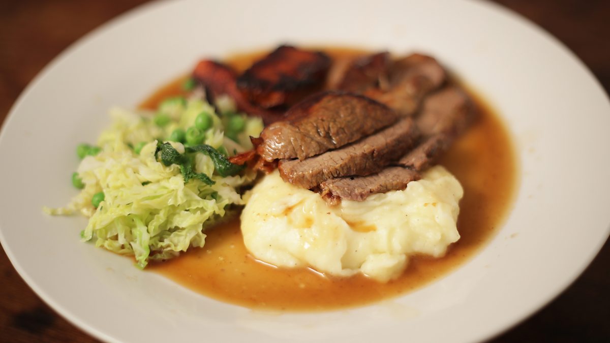 CHUMP ROAST OF LAMB WITH GARLIC MASH AND SAVOY CABBAGE