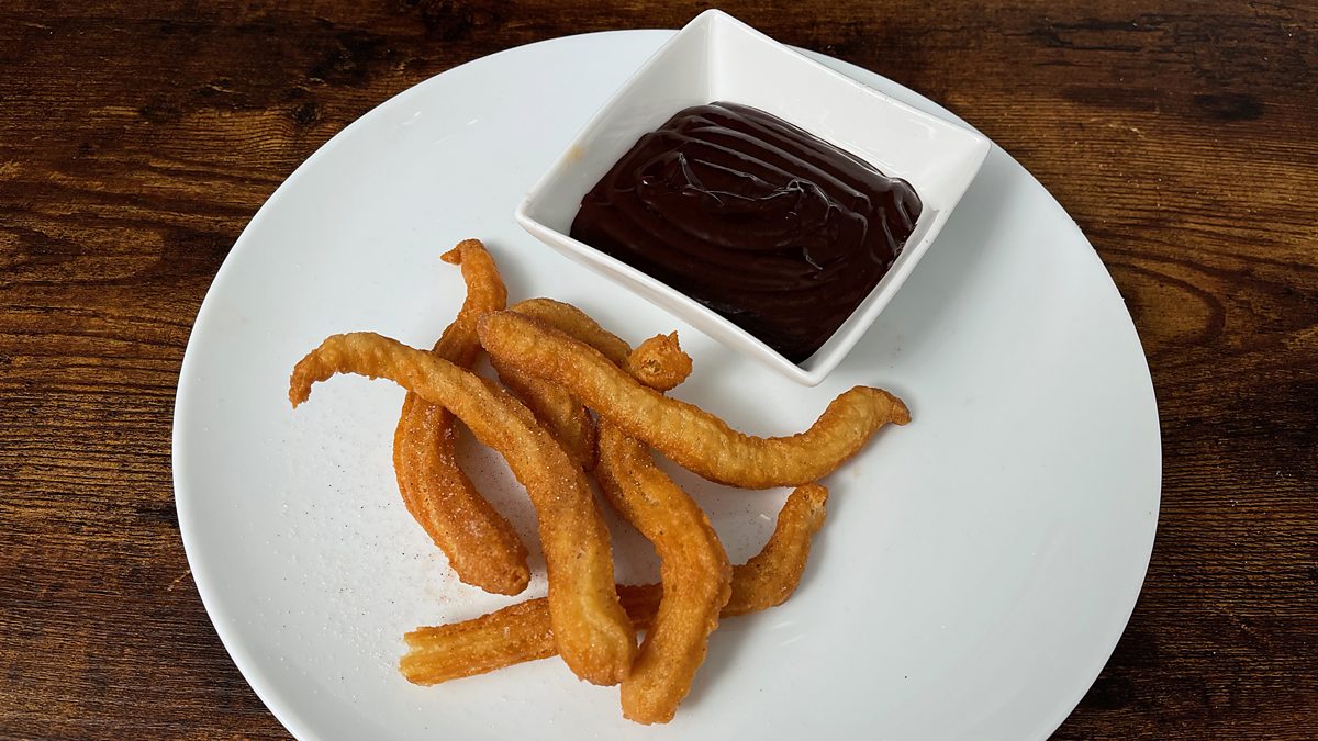 - Fit a star nozzle to a piping bag – 1.5-2cm wide is a good size. Fill with the rested dough, then pipe 2-3 strips directly into the pan, snipping off each dough strip with a pair of kitchen scissors. Fry until golden brown and crisp. Be very careful here – if air bubbles form in the churros they can explode, especially if the oil overheats or you use old flour.