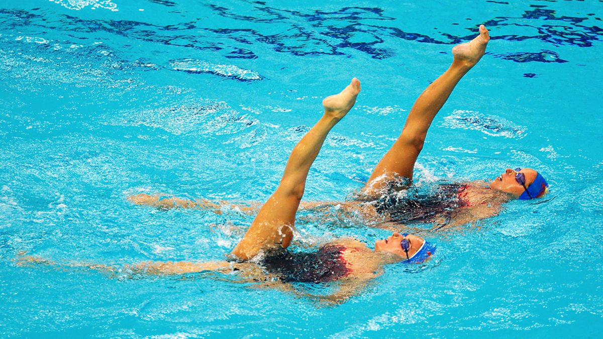 Coverage of the duet free routine, with Olivia Allison and Jenna Randall representing Britain.