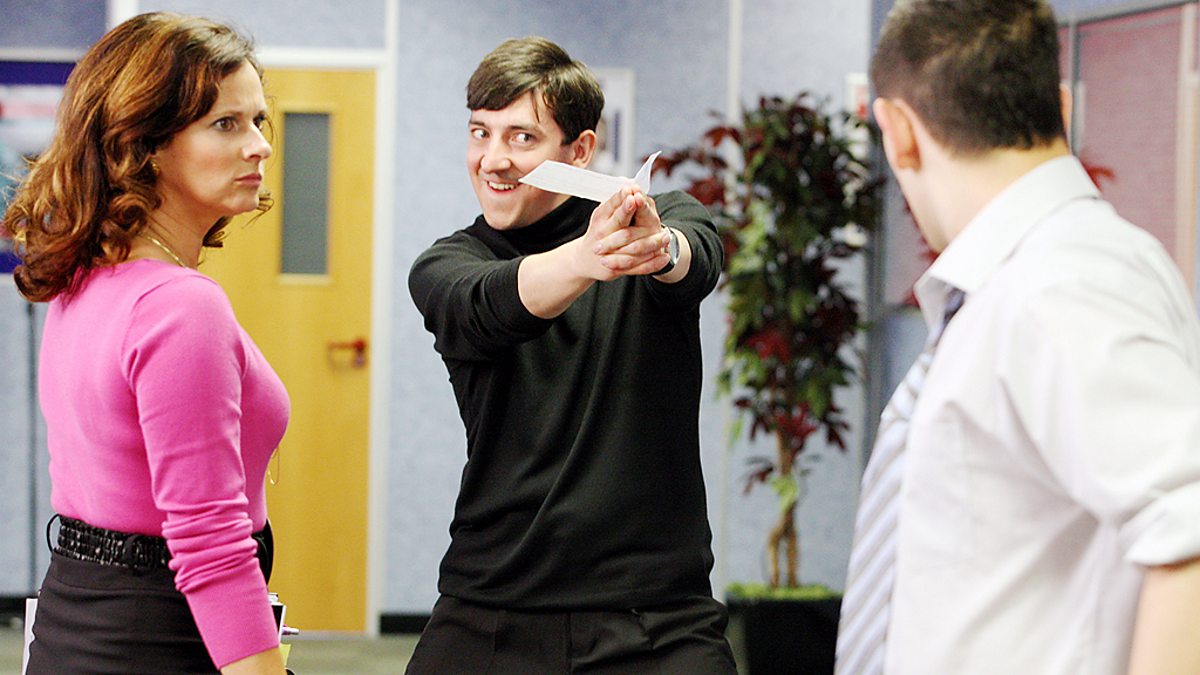 The client who is owed the money is coming in to confront the boss, Mike. Asif has learnt hypnosis and puts Darrel in a trance to try and find the cheque - with alarming conseqeunces.