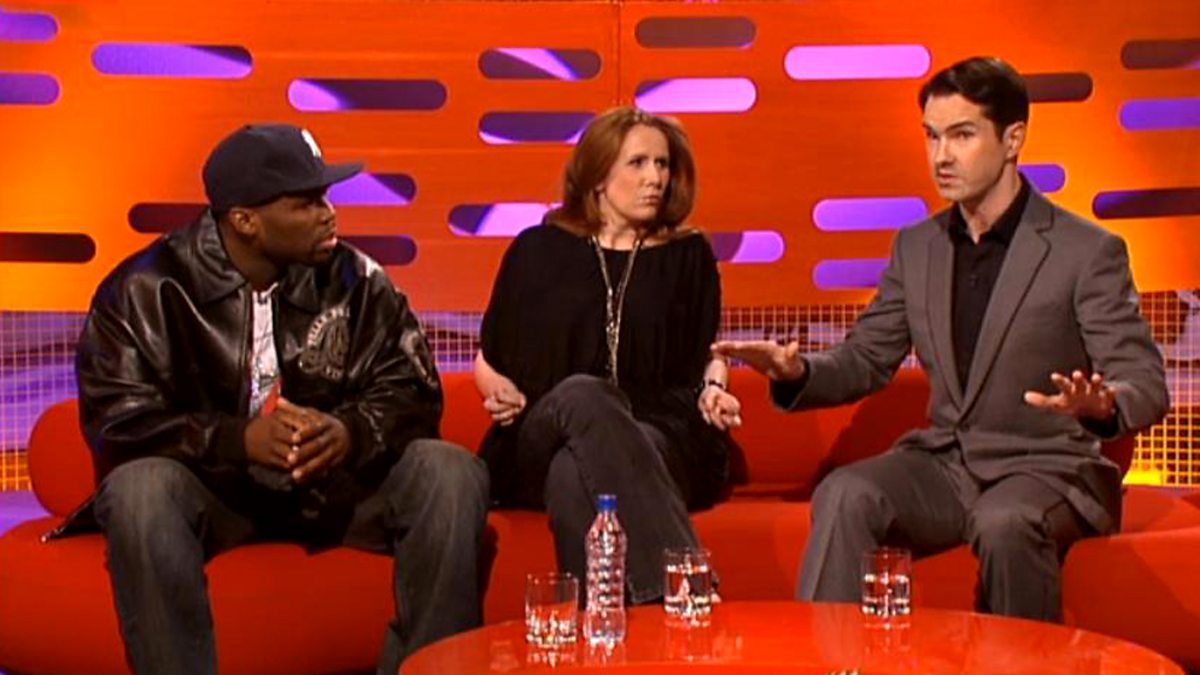 Graham's guests are American rapper 50 Cent, who talks about his controversial life and new album, and sings Baby By Me; actress Catherine Tate who chats about her comic creations; and suave joke merchant Jimmy Carr, who's in the comedy chair.