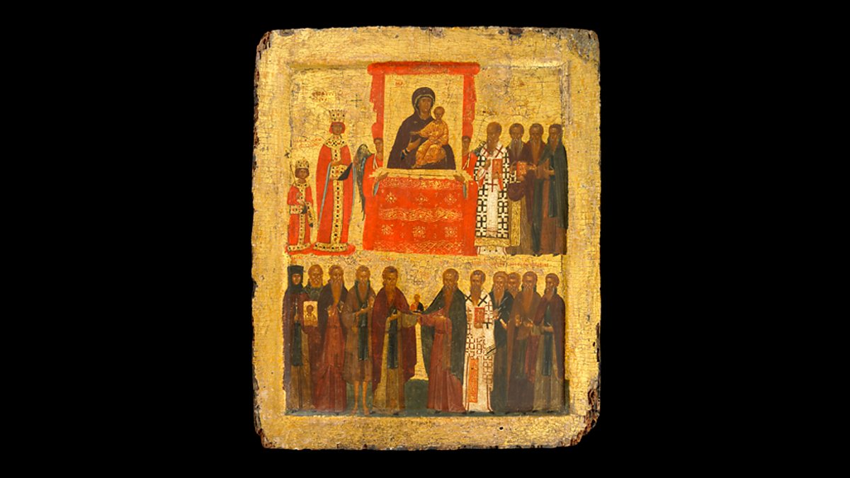 The Triumph of Orthodoxy icon shows the continuing strength of feeling at Constantinople in the fourteenth century about the necessity of images in the Orthodox church. At its centre is shown one of the icons of the Virgin and Christ painted by St Luke and preserved in Constantinople. It is shown venerated by the theologians, monks and emperor and empress who defeated the iconoclasts.