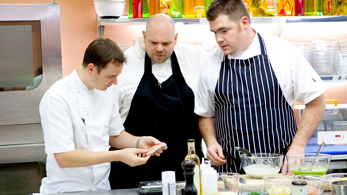 Chefs Paul Ainsworth, Nathan Outlaw and Simon Hulstone cook their fish course. Great British Menu veteran Tom Kerridge decides who goes through to the judges.