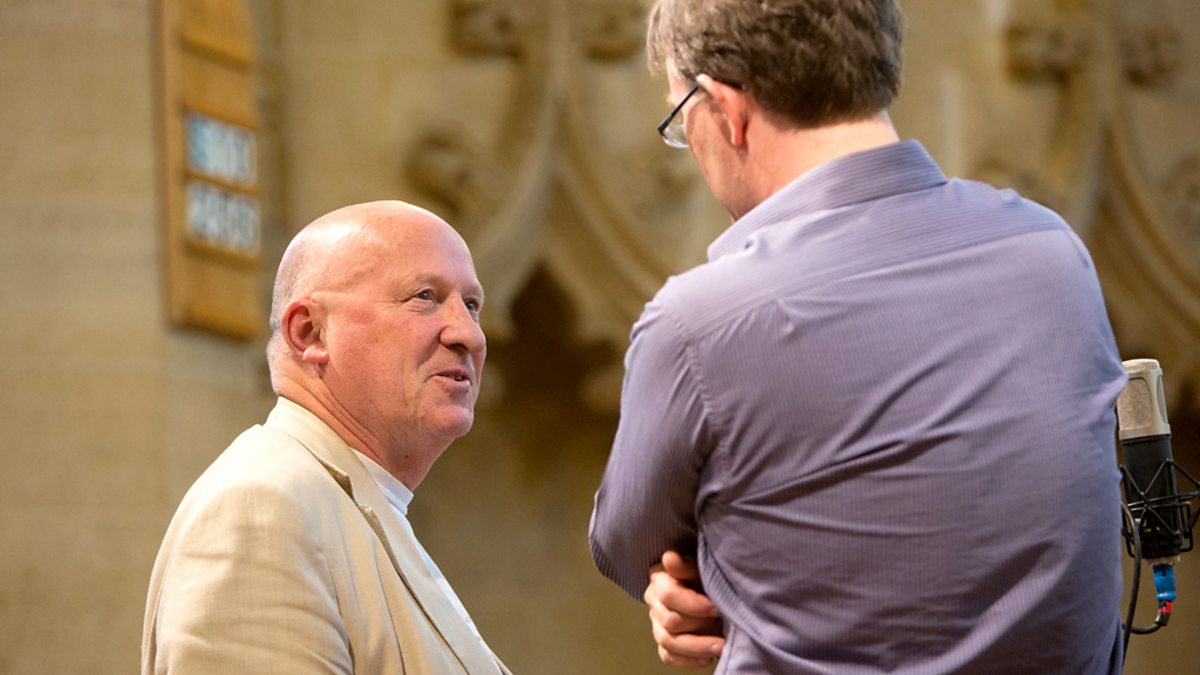 Picture: Gavin Bryars and Peter Davis in the Oakham School chapel. Photo: Rupert Conant.