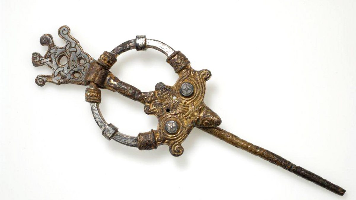 Vikings! A ring-headed pin brooch in bronze, gold and silver with a gripping beast motif in Borre style. The head of the pin forms the shape of a bearded demon. Copyright: National Historical Museum, SwedenBroadcast