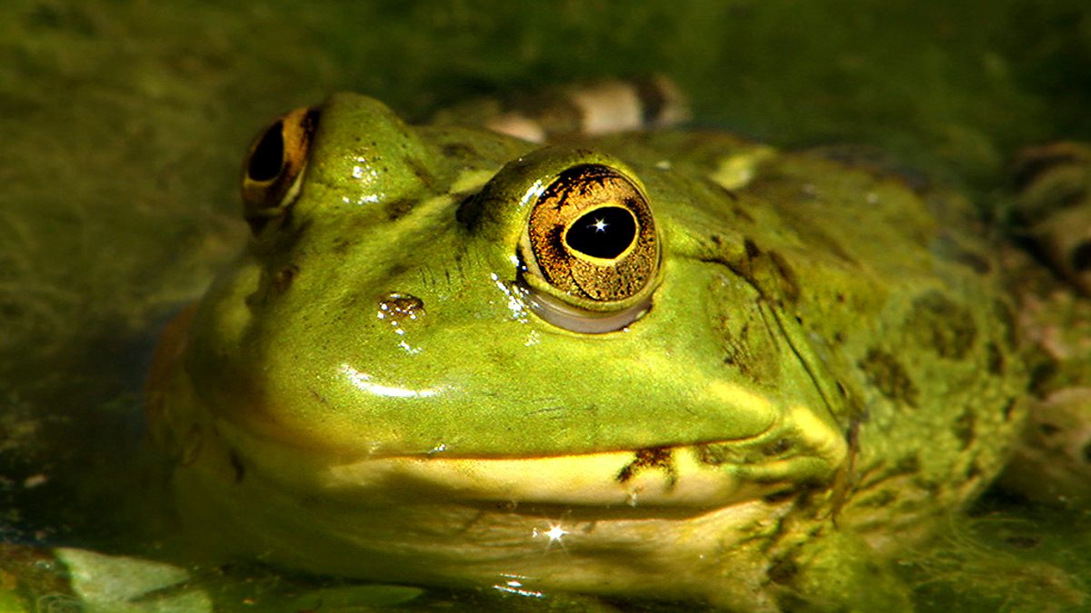 The wonder of different frogs moving around their habitat. We see them move and interact with their surroundings, climbing trees, jumping in slow motion and feeding.